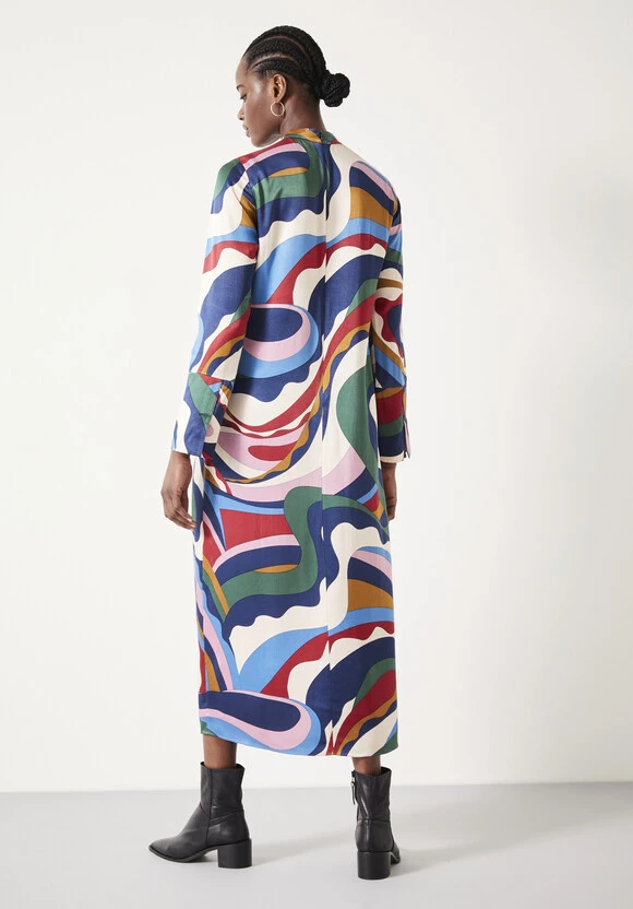 We’re always drawn to those styles that make a statement, and it doesnt get more attention-grabbing than the colourful print swirling across our Rita dress. Cut from slinky satin to form a floor-length silhouette, it’s finished with wide sleeves and a 60s-inspired mock-neck collar.